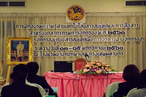 วันที่ 13 พฤศจิกายน 2560 เวลา 13.00 น. นายศักดิ์ชัย แตงฮ่อ รองอธิบดีกรมการปกครอง เป็นประธานพิธีเปิดการฝึกอบรมความรู้ด้านเทคโนโลยีสารสนเทศและการสื่อสาร สำหรับบุคลากรกรมการปกครอง พ.ศ.2561 รุ่นที่ 2 โดยมี นายศุภลักษณ์ ปรีติเขมรัตน์ ผู้อำนวยการศูนย์สารสนเทศเพื่อการบริหารงานปกครอง กล่าวรายงาน ณ โรงแรมบางกอกพาเลส ห้องเพทาย กรุงเทพ