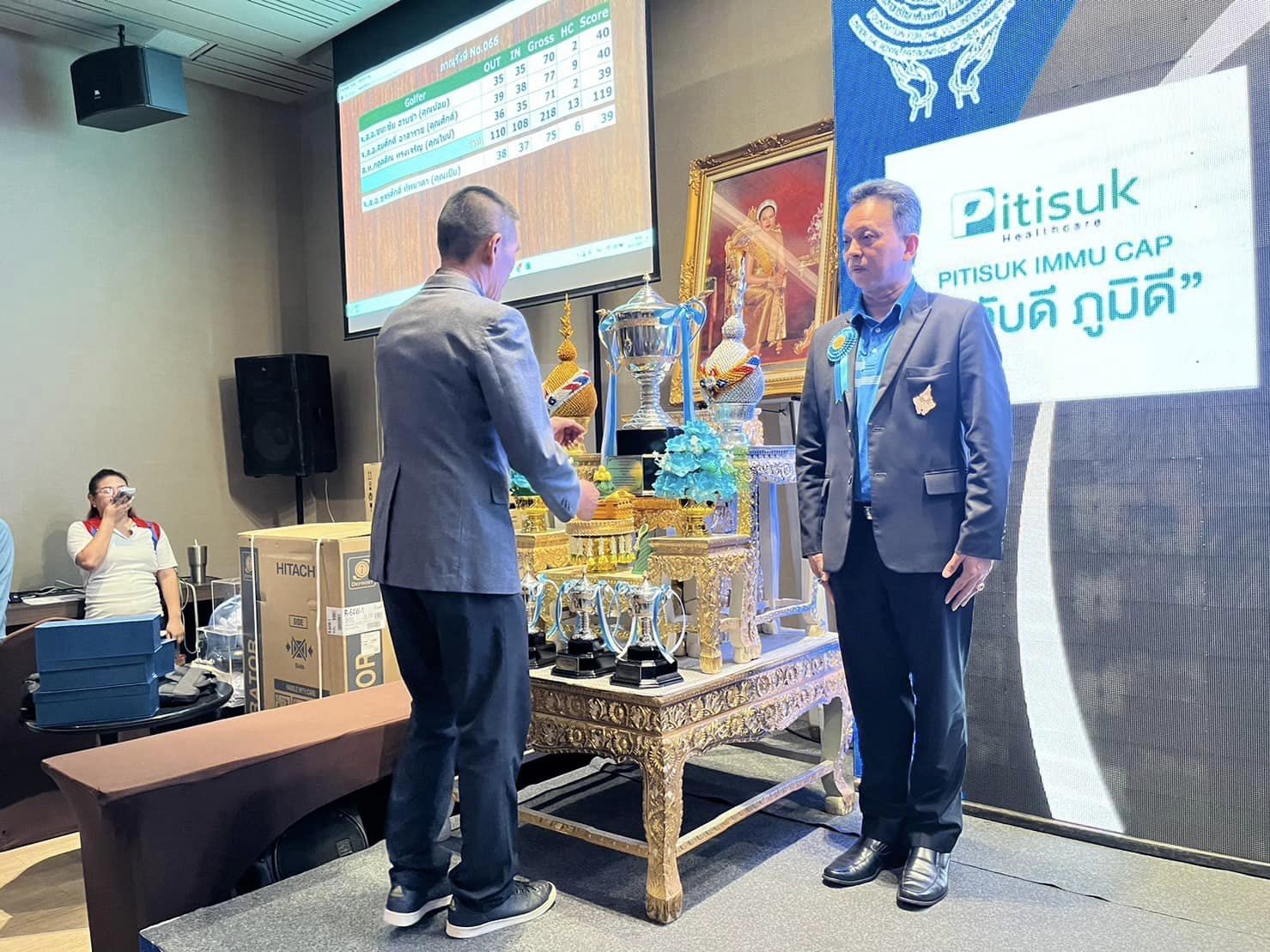 จากนั้นเวลา 18.30 น. นายกองเอกสมศักดิ์ เจริญไพฑูรย์ รองประธานกรรมการมูลนิธิอาสารักษาดินแดน ในพระบรมราชินูปถัมภ์ เป็นประธานในพิธีอัญเชิญถ้วยรางวัลพระราชทานเพื่อมอบให้แก่ผู้ชนะเลิศการแข่งขันกอล์ฟการกุศลฯ จำนวน 1 รางวัล และบุคคลในทีม จำนวน 4 รางวัล โดยได้กล่าวขอบคุณทุกท่านที่มาร่วมงานการกุศลในครั้งนี้ ด้วยความจงรักภักดีและสำนึกในพระมหากรุณาธิคุณของพระบาทสมเด็จพระเจ้าอยู่หัว และสมเด็จพระนางเจ้าสิริกิติ์พระบรมราชินีนาถ พระบรมราชชนนีพันปีหลวง ที่ทรงมีพระเมตตาต่อมูลนิธิอาสารักษาดินแดน ในพระบรมราชินูปถัมภ์ ทรงพระกรุณาโปรดเกล้าโปรดกระหม่อมพระราชทานถ้วยรางวัลสมเด็จพระนางเจ้าสิริกิติ์พระบรมราชินีนาถ พระบรมราชชนนีพันปีหลวง สำหรับมอบแก่ทีมที่ชนะเลิศการแข่งขันในครั้งนี้ นับเป็นพระมหากรุณาธิคุณอย่างหาที่สุดมิได้