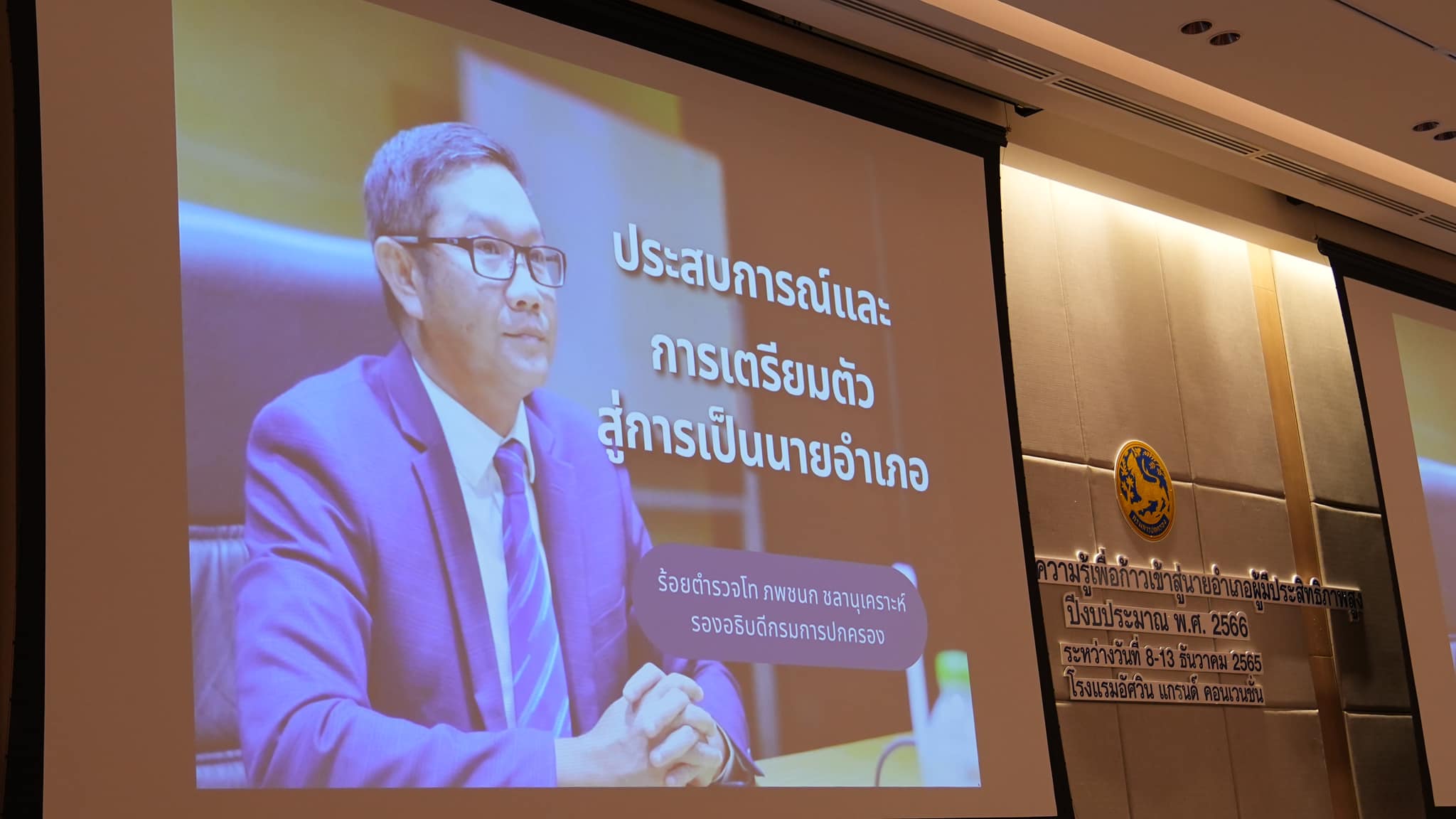 จากนั้น ร้อยตำรวจโท ภพชนก ชลานุเคราะห์ รองอธิบดีกรมการปกครอง ได้บรรยายพิเศษถ่ายทอดประสบการณ์และการเตรียมตัวสู่การเป็นนายอำเภอ โดยเน้นย้ำถึงบทบาทของ “นายอำเภอ” ผู้ที่จะต้องมีความรู้ ความสามารถ มีความรอบคอบ มีสติปัญญา รู้เท่าทันการเปลี่ยนแปลงของโลก ต้องเป็นแบบอย่างที่ดีให้กับผู้ใต้บังคับบัญชา อีกทั้งจะต้องหมั่นพัฒนาตนเอง ต้องหมั่นแสวงหาความรู้ที่เป็นประโยชน์ในการทำงาน และสิ่งที่สำคัญคือจะต้องเรียนรู้ ที่จะครองตน ครองคน และครองงาน ตามครรลองที่ถูกต้องเหมาะสม