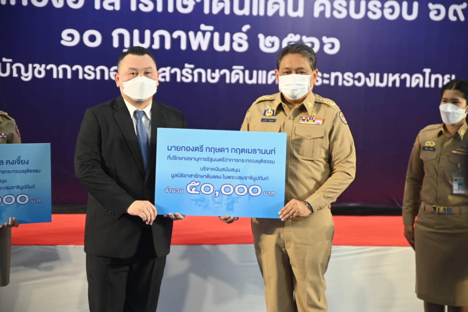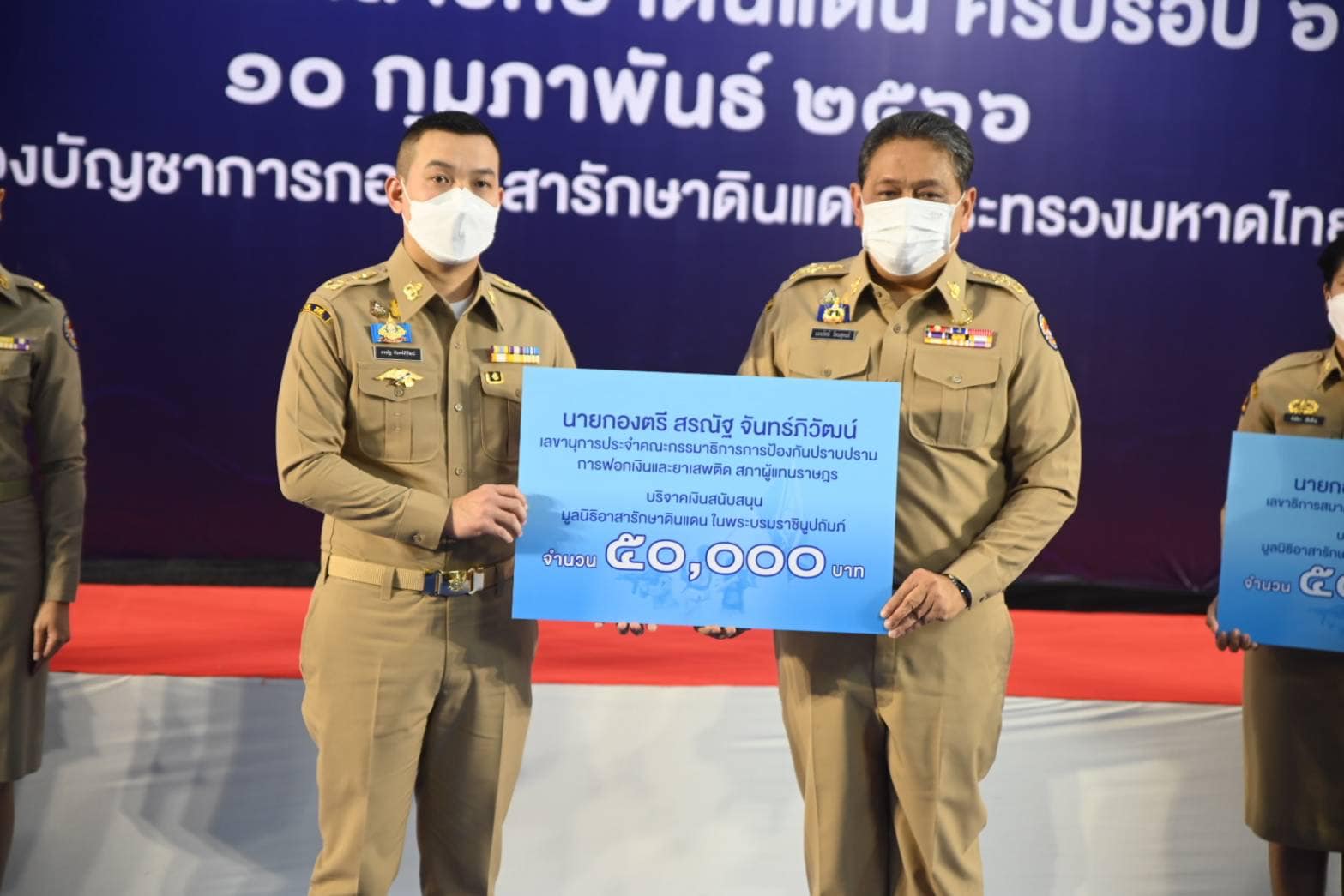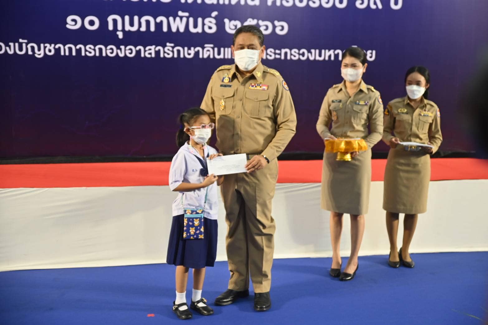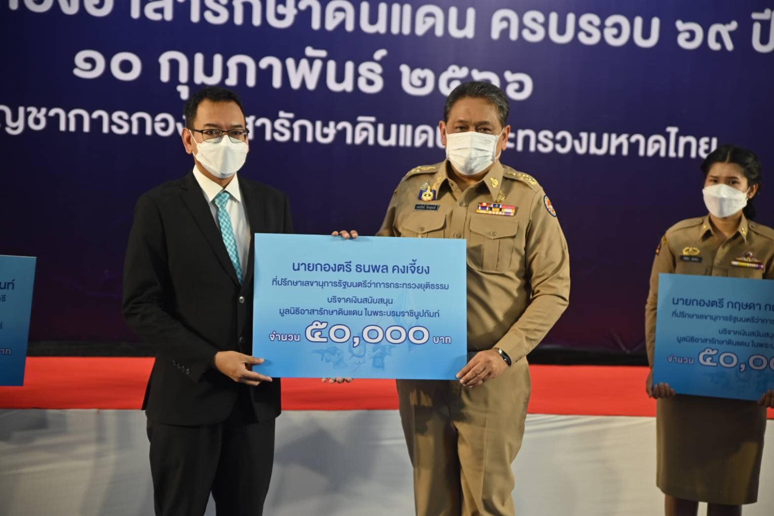 จากนั้น นายกองเอก แมนรัตน์ รัตนสุคนธ์ หัวหน้าฝ่ายอำนวยการ กองบัญชาการกองอาสารักษาดินแดน รับมอบเงินสนับสนุนกิจการ มูลนิธิอาสารักษาดินแดนในพระบรมราชินูปถัมภ์ จำนวน 5 ราย เป็นเงิน 250,000 บาท และมอบทุนการศึกษาแก่บุตรสมาชิกกองอาสารักษาดินแดน ประจำปีการศึกษา 2565 เพื่อเป็นการเสริมสร้างขวัญกำลังใจในการปฏิบัติหน้าที่ของสมาชิกกองอาสารักษาดินแดนทั้งในส่วนกลางและส่วนภูมิภาค จำนวน 628 ทุน รวมเป็นเงิน 1,520,500 บาท สำหรับส่วนกลางมีผู้ได้รับทุนการศึกษา จำนวน 62 ราย