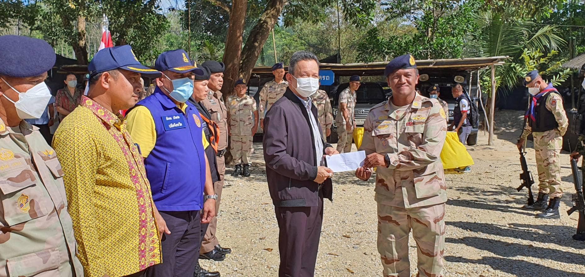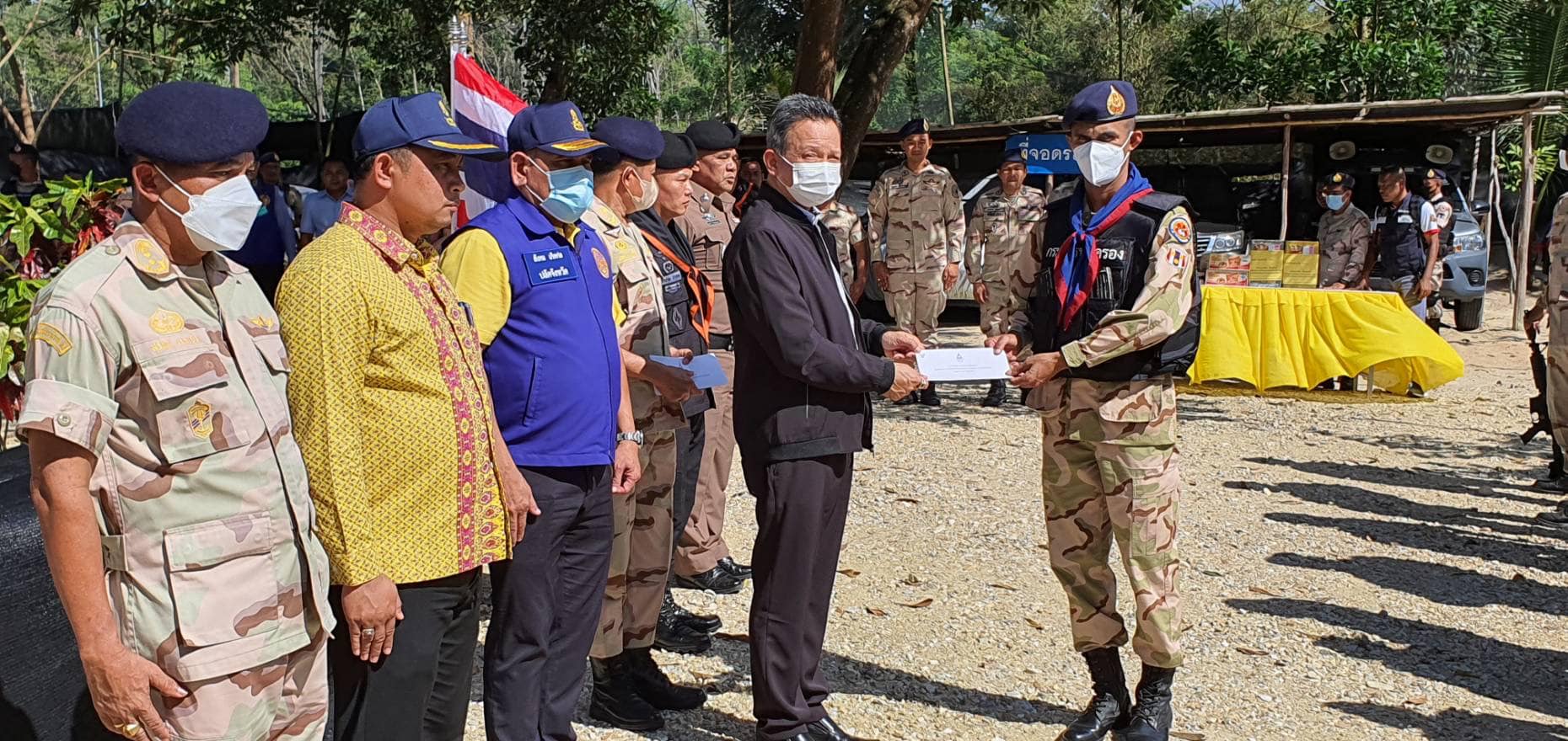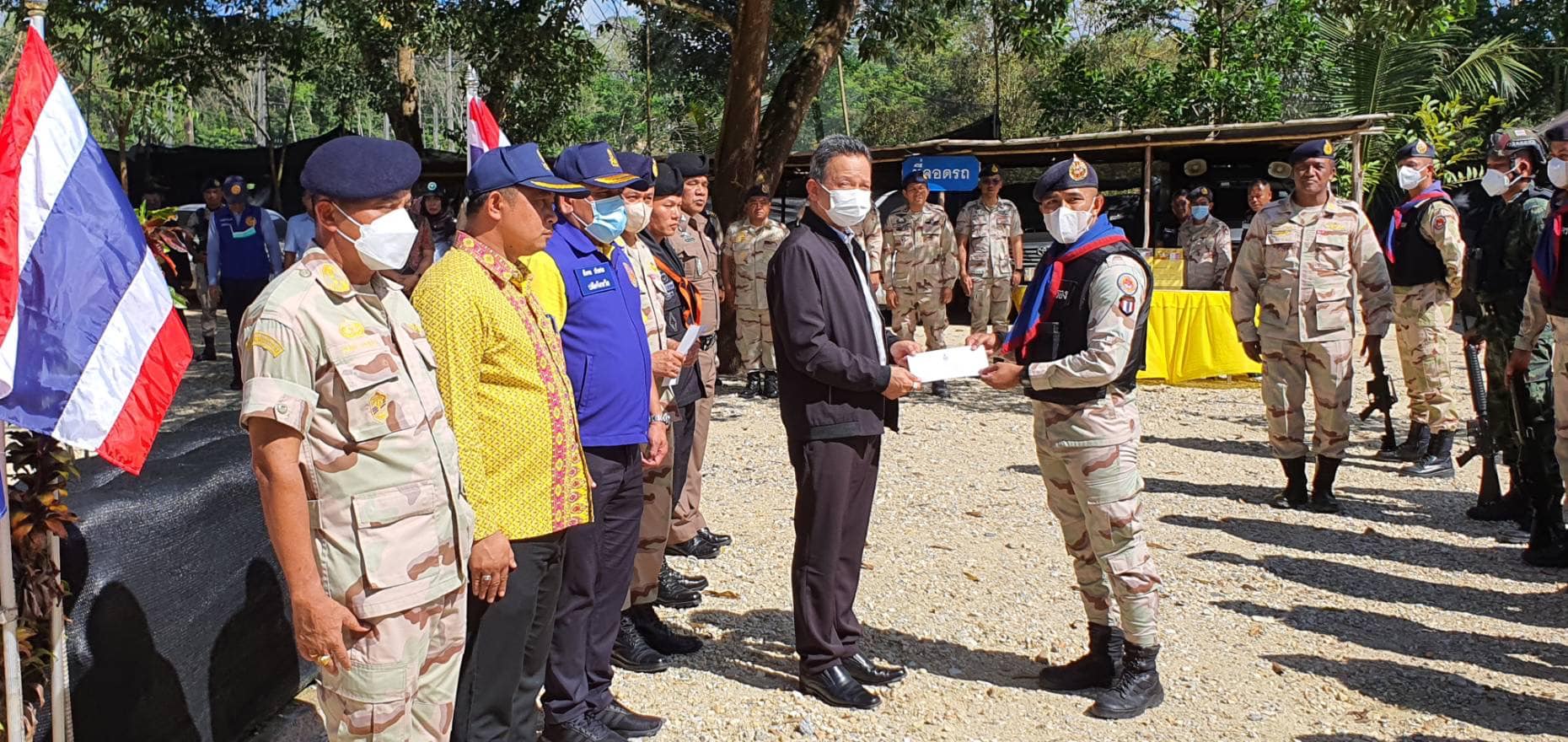 วันที่ 14 กุมภาพันธ์ 2566 เวลา 13.00-16.30 น. นายกองเอกแมนรัตน์ รัตนสุคนธ์ อธิบดีกรมการปกครอง/ หัวหน้าฝ่ายอำนวยการ กองบัญชาการกองอาสารักษาดินแดน มอบหมายให้นายกองเอกสมศักดิ์ เจริญไพฑูรย์ รองอธิบดีกรมการปกครอง/ รองหัวหน้าฝ่ายอำนวยการ กองบัญชาการกองอาสารักษาดินแดน ลงพื้นที่มอบเงินช่วยเหลือจากมูลนิธิอาสารักษาดินแดนในพระบรมราชินูปถัมภ์ พร้อมมอบกระเช้าปลอบขวัญและตรวจเยี่ยมให้กำลังใจสมาชิกกองอาสารักษาดินแดนชุดคุ้มครองตำบลสาวอ อำเภอรือเสาะ จังหวัดนราธิวาส ที่ได้รับบาดเจ็บจากเหตุการณ์ความไม่สงบในพื้นที่จังหวัดชายแดนภาคใต้