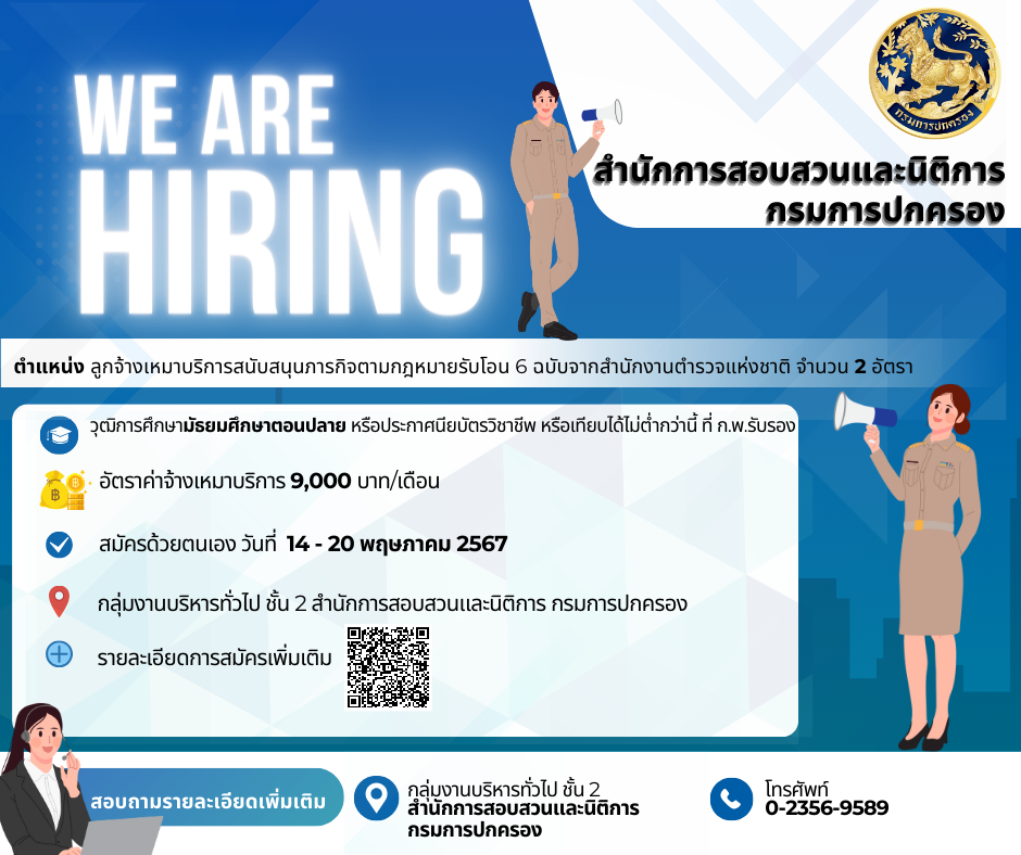 เรื่อง รับสมัครคัดเลือกบุคคลเพื่อจัดจ้างเป็นลูกจ้างเหมาบริการสนับสนุนภารกิจตามกฎหมายรับโอน 6 ฉบับจากสำนักงานตำรวจแห่งชาติ ประจำปีงบประมาณ พ.ศ. 2567